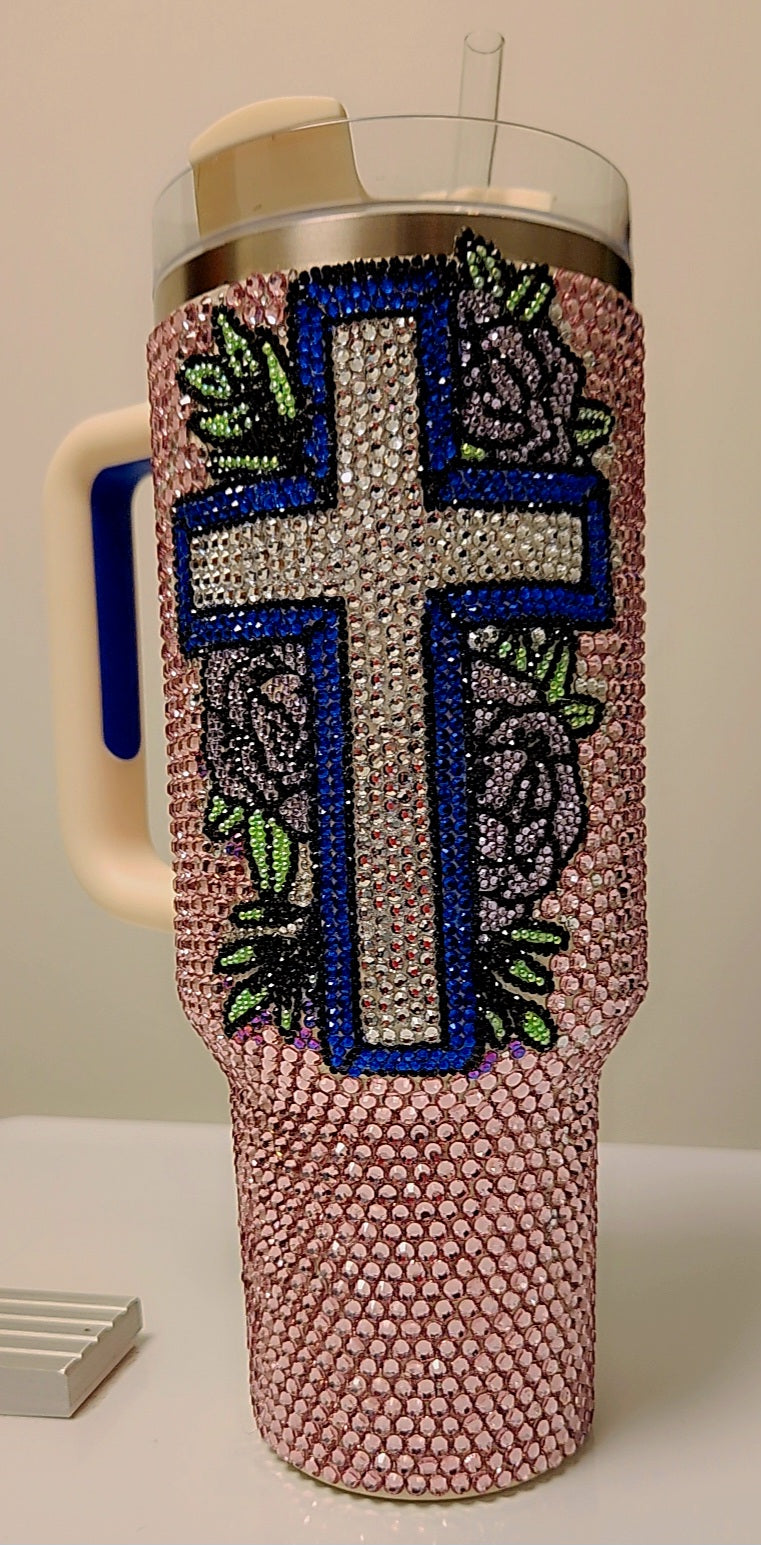 40oz rhinestone tumbler! Every inch is hand-covered in sparkling pink crystals, featuring a stunning jeweled cross with floral accents for a bold, elegant statement. The double-wall insulated design keeps your drinks hot or cold for hours, while the sturdy handle and straw lid make it perfect for daily use or gifting.